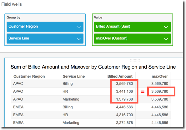 maxOver ( sum({Billed Amount}), [{Customer Region}] )