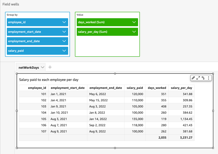 The following example calculates the number of days worked by each employee and the salary expended per day for each employee: