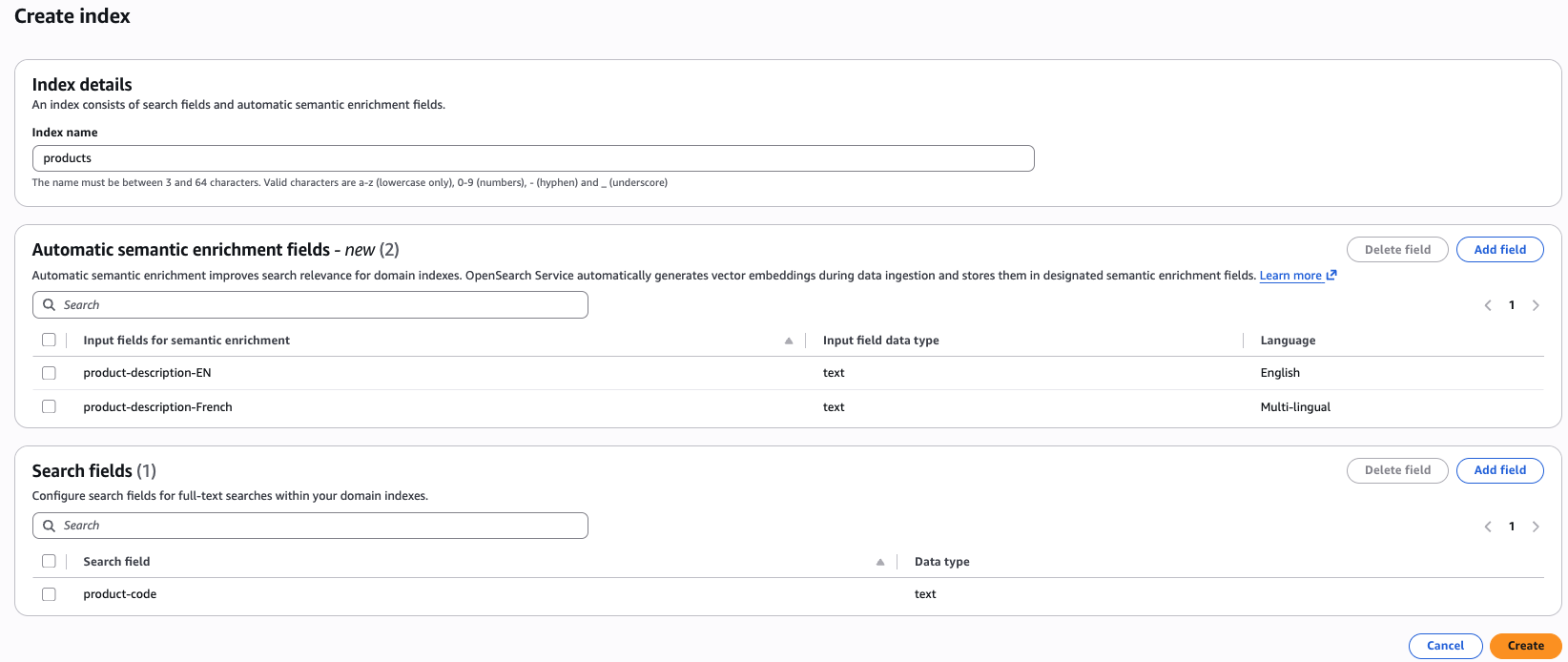 为文本字段设置启用自动语义扩充功能的索引非常简单,而且在创建新索引期间 APIs,您可以通过控制台和 Amazon CloudFormation 模板对其进行管理。要为现有索引启用该功能,您需要在为文本字段启用自动语义丰富功能的情况下重新创建索引。