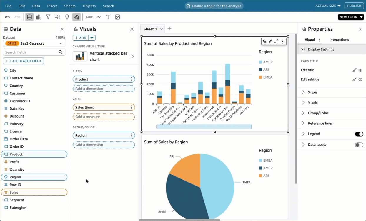使用字段级别着色,您可以为快速分析或仪表板中所有视觉对象的特定字段值指定特定的颜色。颜色按字段指定,既可简化颜色设置过程,又可确保使用同一字段的所有视觉对象的一致性。例如,假设您想为自己的航运公司创建一组视觉对象来追踪不同地区的运费。您可以使用字段级别着色为每个地区指定不同颜色,用以表示分析或控制面板中所有视觉对象中的字段。如此,账户读者可以快速了解其正在寻找的字段颜色,更轻松地找到所需信息。